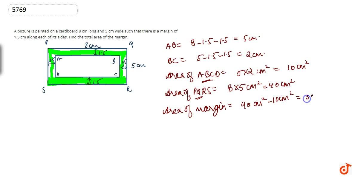 A Picture Is Painted On A Cardboard 8 Cm Long And 5 Cm Wide Such That There Is A Margin Of 1 5 Cm Along Each Of Its Sides Find The Total Area